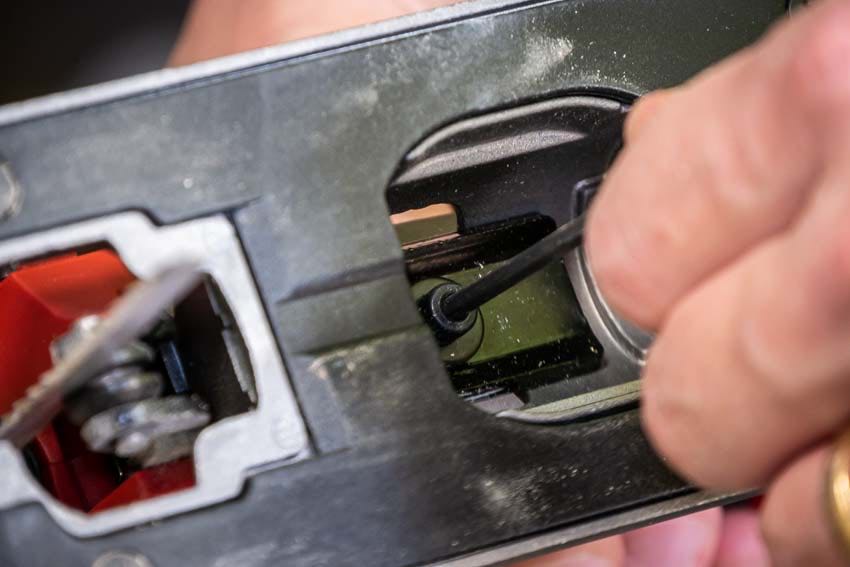 Blade changes have a little twist. Or less twist, actually. Instead of the typical twisting blade clamp, you just push the collet up to release the blade. Thereโs no spring ejection and you have to use two hands to install your blade, but we find that itโs a little easier than other styles.
