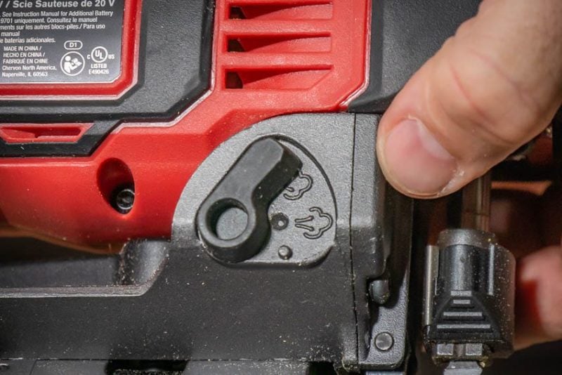 Skilโs brushless jigsaw features three levels of orbital action which you adjust with a lever on the side. Higher levels of orbital action produce a more aggressive cut and trade off a bit on cut quality and precision along with an increase in tear-out.