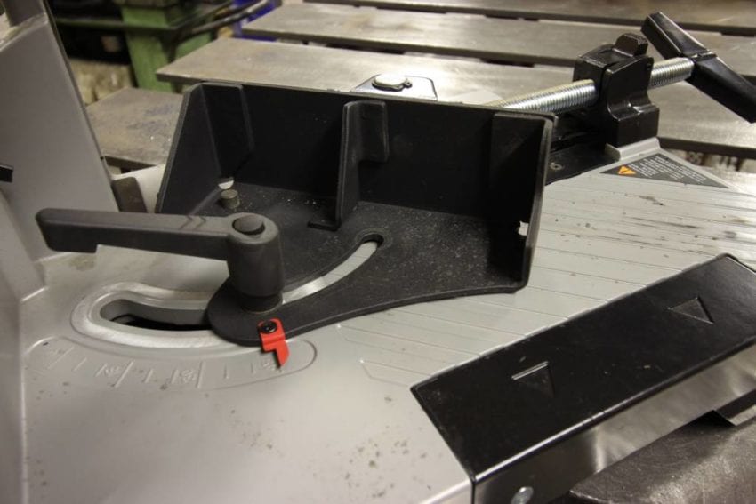 The Skilsaw SPT62MTC-22 sits very sturdy and level on its five rubber feet. The fence/clamp system seems pretty stout compared to my abrasive saw. I also noticed you can adjust the fence angle conveniently without tools. Many other saws in this classย require a separate tool to loosen and adjust the fence angle. Thatโs a nice feature.ย