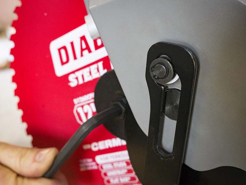 A nice, deep chip collector is placed at the rear of the saw. Since dry saws donโt generate the heat that abrasives do, you wonโt have to worry about slag collecting inside.