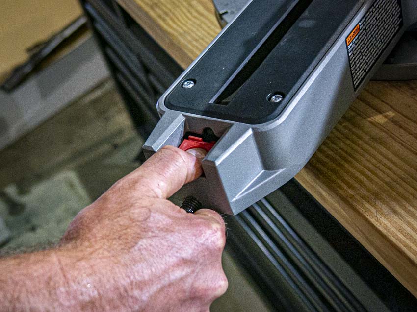 Miter adjustments are pretty standard with a front lock and detent override. The nice thing is that the detents are nice and solid. So far, weโre not seeing any wear on the plate that would cause us to lose accuracy.