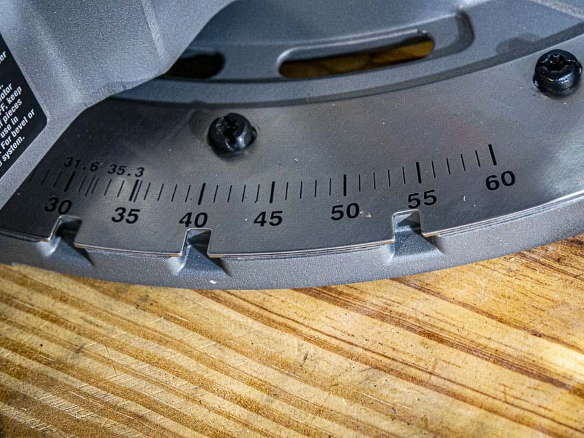 The bevel stops use a sliding step system. Theyโre easy to use and see, but sawdust can collect on it while youโre cutting. Be sure to blow them off if youโre making frequent bevel cuts.