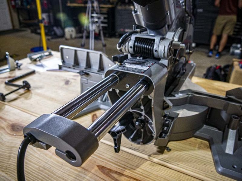 The Skilsaw Worm Drive Miter Saw uses a 2-rail system set in line with the saw instead of offset to one side. Itโs rock-solid with no wobble and gives the saw a smooth sliding action. Itโs not one of the space-saving designs, however. Youโll need to make sure you leave room to the wall for the rails.