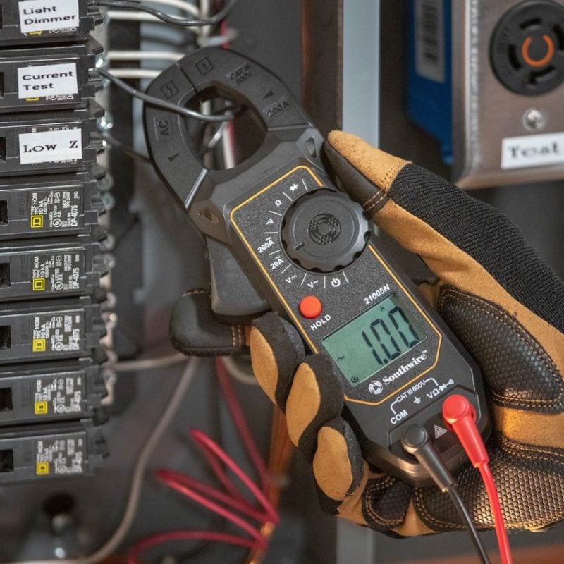 The Southwire 21005N clamp meter doesnโt appear on the Southwire website apart from the kit. This barebones meter measures the basics. It reads AC current up to 200A. It also handles AC/DC voltage up to 600V along with resistance, continuity, and diodes.