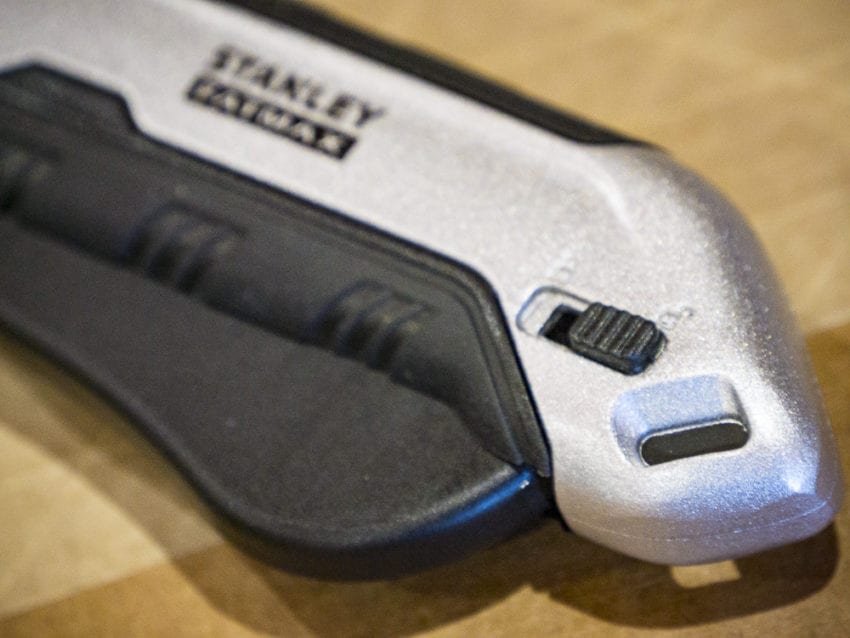With the same safety intent behind the design, thereโ€™s a second option if you want a solidly built Stanley FatMax safety knife. This one has a thumb-slideย for bladeย extension. Like I mentioned earlier, this style doesnโ€™t seem as natural to use since your thumb is forced into service pushing the blade out. It also means you canโ€™t use a reverse grip.