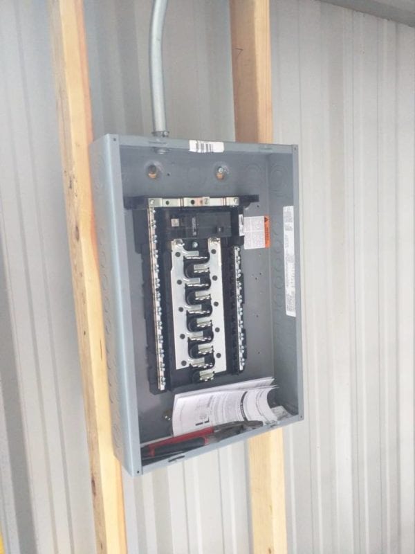 The power coming from the utility company will be running through a Square D 40-circuit 20-space 100-amp main breaker load center.ย This not only took care of our immediate needs for terminating the steel building electrical conduit, but also gave us plenty of expandability as we grow in the near-future.