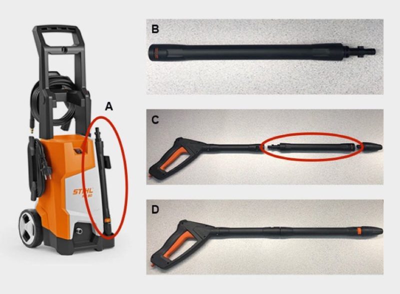 Stihl sold the RE 90 Pressure Washers at various authorized Stihl dealerships between May 2019 and October 2019. At the time they cost around $180. The pressure washer features a gray and orange color scheme with the model number printed on the front. The recalled spray wands have round pins and no notches holding the wands in place. Replacement wands from Stihl have square pins and notches.