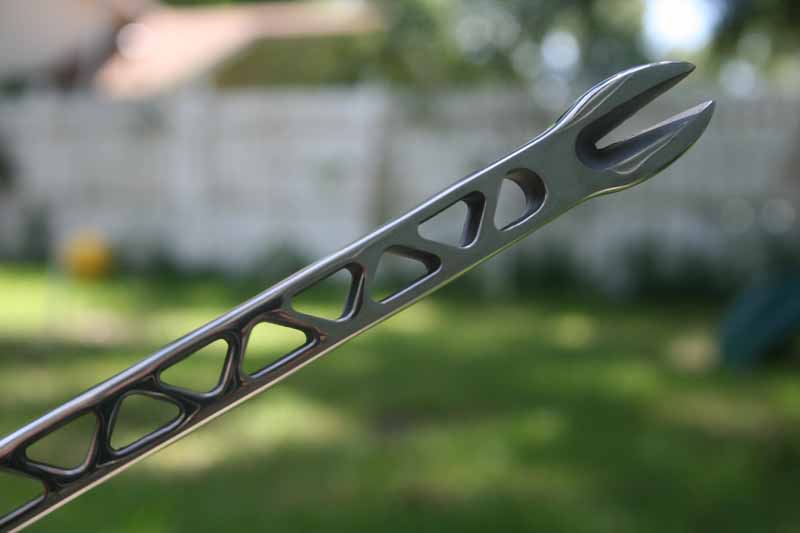 The Stiletto 15โณ Pry Bar and 12โณ Clawbar Nail Puller arrived wrapped in plastic but were otherwise ready to be used immediately and not enclosed in any sort of retail packaging. The tools both have a mirror-polished finish with imprinted black lettering and logos on the main flat parts of the bars. They are pristinely sharpened along the edges of the pry bars and there are no mold marks or other blemishes that indicate how the tools were manufactured. We took a closer look at the two different types of pry bars we received.