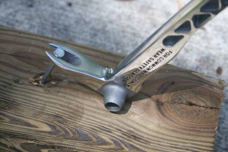 This specialty claw bar is one of the coolest-looking pry bars weโve ever seen. Like the Stiletto titanium claw bar, the network of cross-bracing along the length of the tool reminds us of a steel roof crossbeam. Itโs a work of artโand one that came in very handy when we had to pull nails. The dimpler mechanism is also convenientย in that it allows you to place the hole over the nail and then whack it with your hammer (we used a Stiletto Titanium Hammer). The result is a โtrenchโ of sorts cut around the nail which then gives you access to pull the nail with either end of the clawbar. It really works well, as you can see in the photosย below.