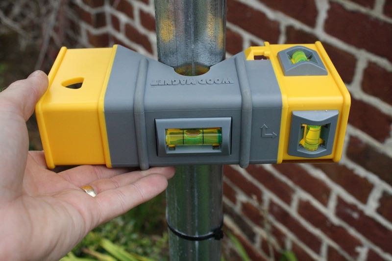 Once the level is attached to a piece of 2x, it can then be used in the same way that a level is used. The idea is that if you forget your long 4 or 6 ft level, you can get a โstraightโ (as possible) piece of lumber, attach this baby to the middle of it, and you then have a level of whatever length you need. In addition to fitting it to standard 2x materials, it can be used to plumb both square posts and round pipes up to 4โ in diameter. If you start to think about it, this can be a pretty handy hands-free stud level, plate level, screed level, or post level!