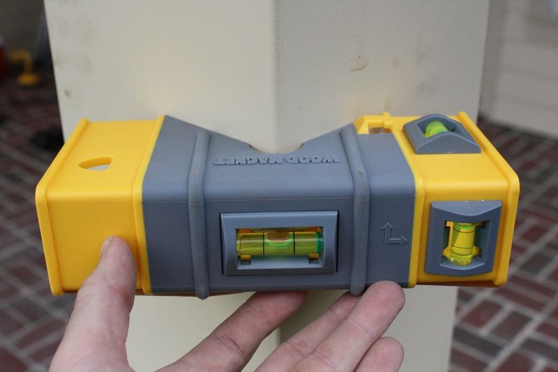 We used it to plumb studs in a little renovation project. It was very handy because we did not have to hold a level, position the stud, and then try to shoot it in place with our nail gun. We simply were able to attach the wood magnet to the stud, plumbed it up, and nailed it in. For plumbing up some posts for a small deck project, we found that the wood magnet worked pretty well. Again, we were not big fans of the rubber band thing, but it did work, and it was nice that we did not have to stand there and hold a level on the post.