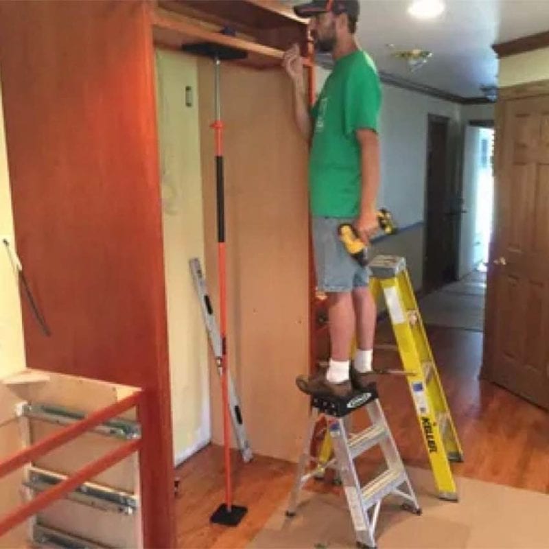 The T-Jak Cabinet Jack was originally designed to assist carpenters install wall cabinets easily. It does away with the need for using 2x4s and ledger boards for supporting cabinets, drywall, or anything else you need to hang at height.