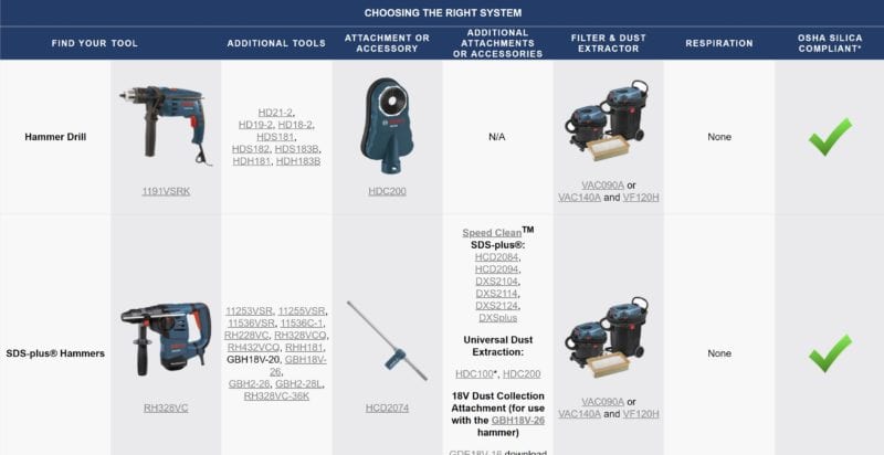 Back in early 2017, OSHA announced new silica dust regulations that would affect the entire construction industry. Bosch proactively contacted us to start the push toward education before the September 23rd deadline. That date has come and gone, but thereโ€™s still plenty of confusion running around about what you need and what you donโ€™t. Many manufacturers like Bosch, Makita, and others set up specific pages on their websites to help Pros navigate OSHA Table 1 compliance.