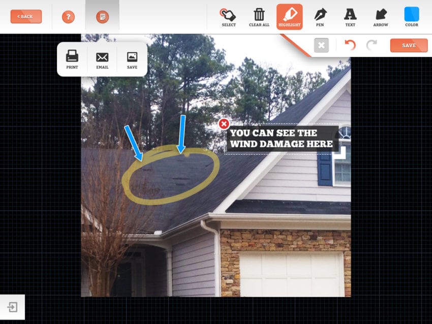 One of the features I really like is the ability to take a picture of the roof and simply draw on it. Highlight a problem area that has a specific requirement and make a notation to make sure that your guys see it. The app is capable of acting as a stand alone tool, but can also be integrated to with other devices so projects can be shared via Cloud.