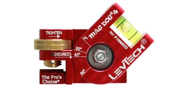 Now, we’re getting to LevTech’s multi-degree levels, starting with the LevTech Mag Dog 4. Like the Mag Dog One mentioned above, it’s compatible with most pipe sizes, however, it connects a little differently. This model, along with several others in the lineup, features a thumb wheel that moves a threaded clampdown attachment that lets you adjust between pipe sizes.