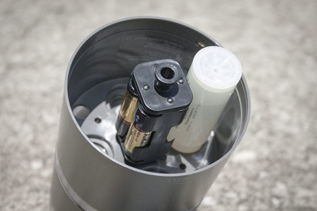 The bottom cap pops off of the cylinder to reveal ports for up to four liquid butane fuel cartridges and spots for four AA batteries. You can install as few as one butane cartridge โ€“ they burn in sequence so more cartridges donโ€™t increase the amount of allethrin released or the size of the protection zone. Each cartridge just increases the runtime, which is about 12 hours each. ย The batteries arenโ€™t necessary for the repellent release. Rather, they power the ZoneCheck Monitor. If you donโ€™t have batteries or they die, the Halo can still protect you from those little flying vampires.