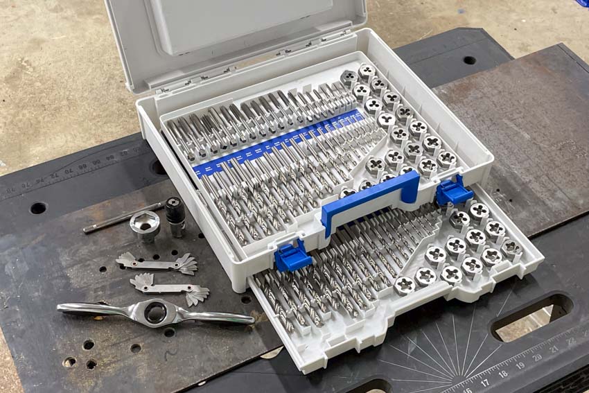 For all sizes, toolant includes a tap, die, and drill bit. Hereโs a list of whatโs in the case: