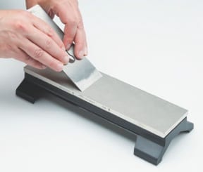 I must confess to having a Zen Masterโs fondness for Japanese water stones, but they are a lot of rigamaroleโflatness being the most problematic. The DMT Diamond Plate is dead flat out of the box and always will be. When reforming a really dull edge, nothing cuts faster than diamonds. When sharpening very narrow tools, such as an one-eighth inch wide bench chisel, it is very easy to gouge a trench in a water stone. For this reason I donโt let my students touch mine! The diamond plate takes this in stride, and I feel that I can now fearlessly let anyone borrow it. Like the eight-hundred pound gorilla, you canโt hurt it.