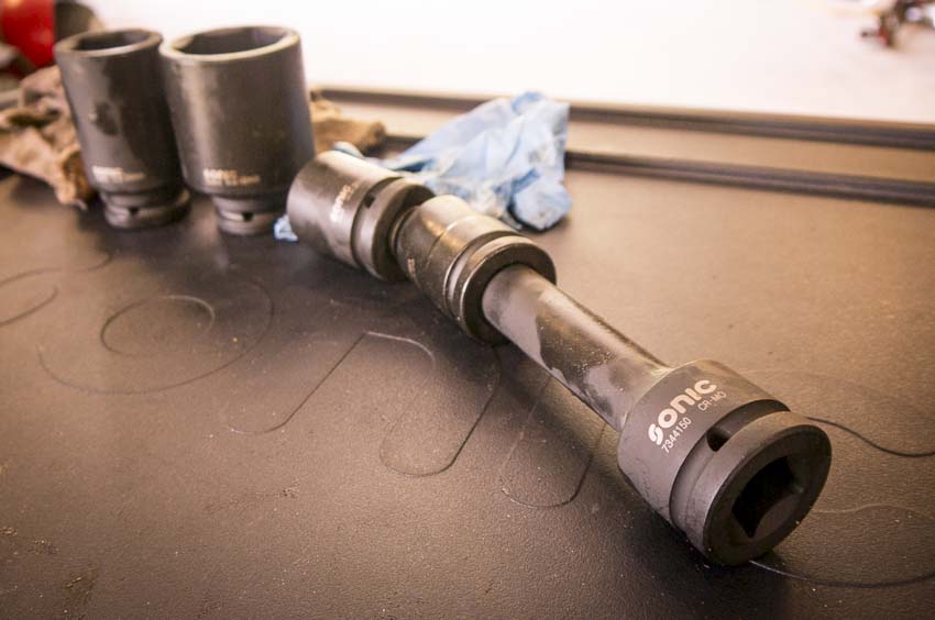 Impact Accessories_8Included in the Sonicย impact sockets set were several accessories such as extensions, universal adapter, and 3/4โ€ณ-to-1โ€ณ adapter. Having these accessories in true impact form really helps when the fastener you are working on is hard to reach. Working under and around this truck required fitting in spaces already accompanied by hydraulic hoses and fittings. Using the extension and universal was a must and they performed flawlessly.