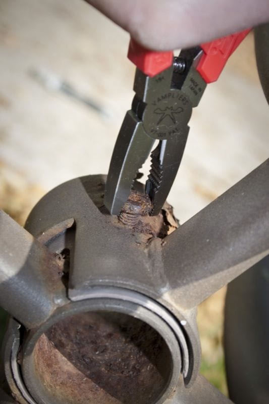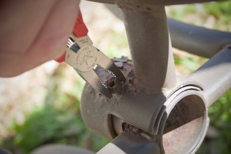 We had to see it for ourselves, so we took the pliers immediately to a rusted patio table that needed to be disassembled and discarded. The problem was, the bolt holding the two interlocked pieces together was completely rusted throughโand thus impossible to remove with a standard hex wrench. The inner walls of the screw were falling apart just like every other part of the table, causing the bolt to strip out immediately upon insertion of an Allen wrench.