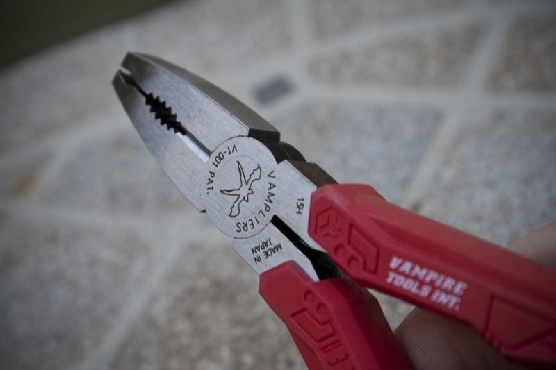 Then we applied the Vampliers. First off, the Vampliers are really comfortable to use. You probably wonโt keep the rubberized cover that slips overtop the closed jaws, but the same red elastomer material covers the handles and itโs easy to grip in the hand. The design is sort of odd, with a lot of detail and many angular features that make us think the entire point is to make sure these donโt slip out of your hands. Theyโre comfortable, but comfort doesnโt seem to be the primary purpose.