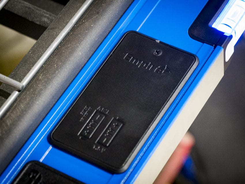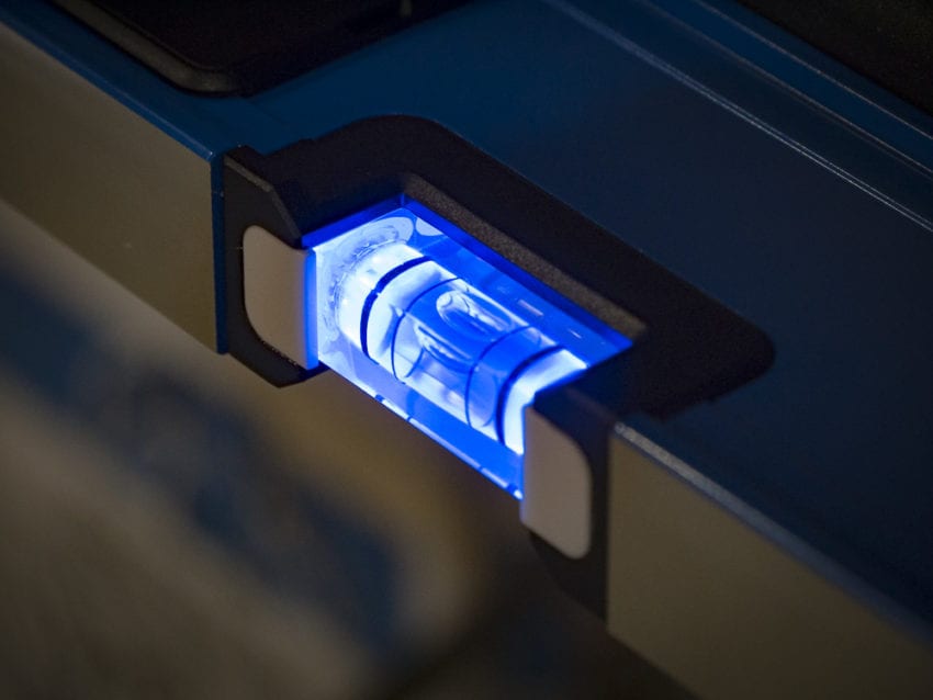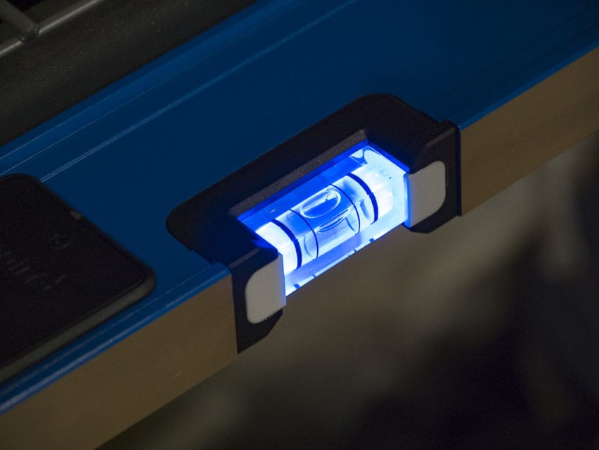 Two AA batteries power the LED feature on this level, providing up to 32 hours of LED lighting. Press the button once, and the LEDs light up the top vial. Press it again, and the LEDs switch to the plumb vials. The LEDs can be turned off by holding down the power button for two seconds, or you can leave it alone and they will shut off after two minutes. As the batteries die, the LEDs will flash when you turn them on.