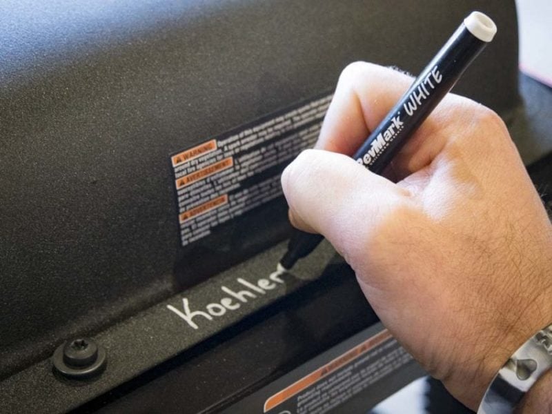 The new RevMark white ink industrial marker picks up where the original RevMark pens leave off. Dark colors are great, but sometimes I need to write on dark material like cast iron. Thatโs when I normally turn to a paint marker. Then I throw on some Santana and do my best rumba to shake the thing up. If Iโm lucky, David C. Smith and his Safety Third team didnโt leave the cap off and let it dry up.