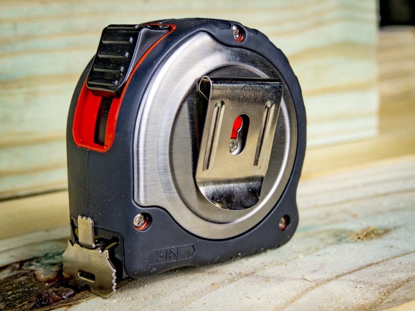 The tape comes with a stainless steel belt clip. This design works well for sliding on and off your belt with ease, but we do have a few questions about the strength of the design for people that are tough on tapes.