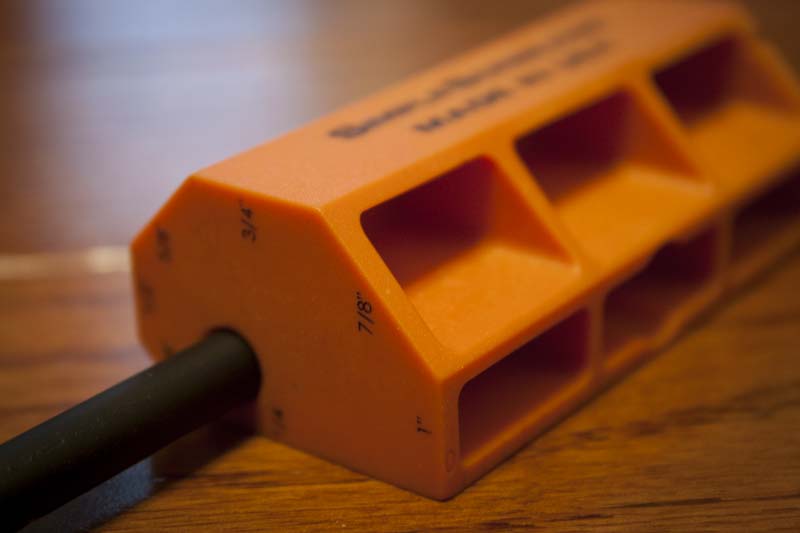 The tool uses a standard round #2 pencil which threads into the plastic body of the scribing tool. Thereโs no wobble, and the pencil is unable to fall out. Since itโs held so tightly, sharpening needs to be done from without. You donโt want to remove the pencil once itโs inserted until you need to replace it.ย Because there are seven different offsets, scribing is just a simple matter of understanding the furthest distance of your wood pieceโs variance and then setting the scribe to just above that setting.