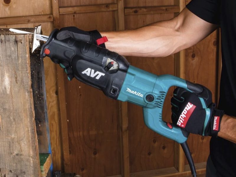 The Makita 15-Amp AVT Recipro Pallet Saw is built on the foundation of their heavy-duty JR3070CT model. It’s an excellent saw that also has an update as the JR3070CTZ—the same saw without a lock-on. The pallet saw includes the lock-on button.