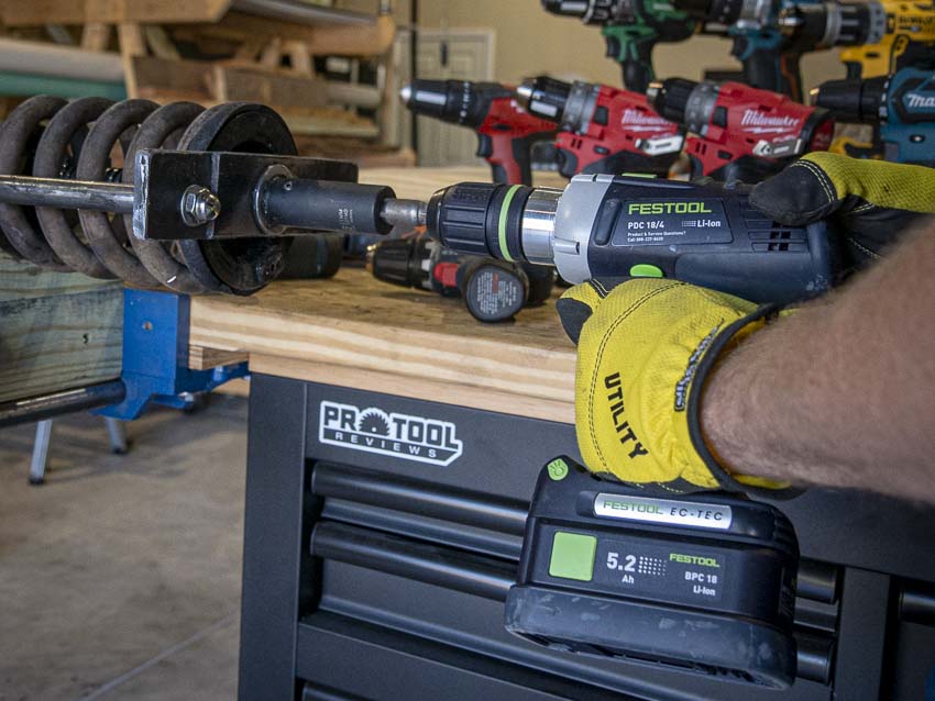 With an incredibly quick no-load speed of 3,800 RPM in high, theย Festool PDC 18/4 QuaDrive is an absolute dream in drilling applications. Without stopping in between, it took just 22.23 seconds to drill twelve 1/4-inch holes in 3 inches of stacked plywood. To put this in perspective, the fastest drill in our shootout took 25.66 seconds, and we tested it twice because it was so far ahead of the rest!