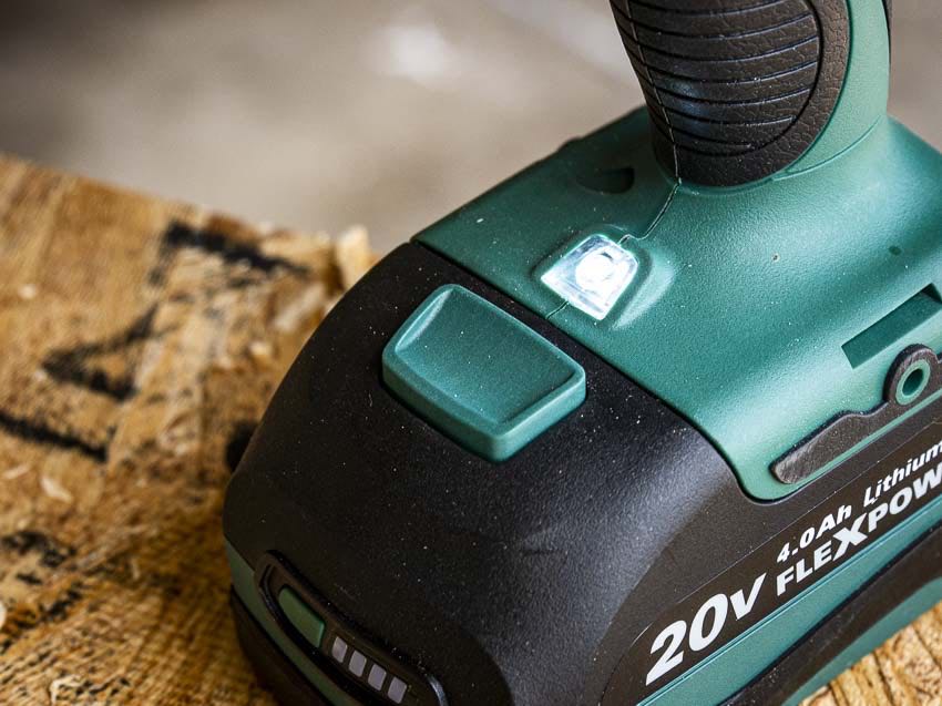 The Masterforce 20V brushless drill features a brushless motor, a keyless 1/2โ€ณ chuck, and 24 clutch settings. An LED light is in its traditional place above the battery, and thereโ€™s a 2-speed gearbox you can toggle at the top of the unit.