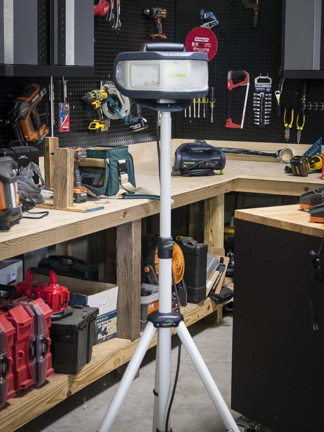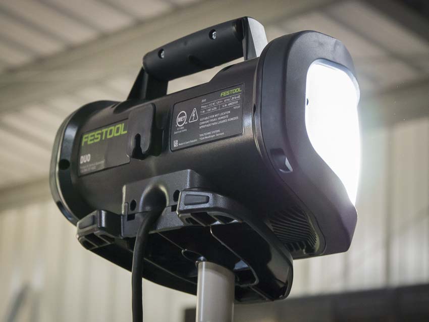You can get the Festool SysLite DUO-Plus Work Lite as a standalone tool with a Systainer 3, or you can opt for the Festool SysLite-Set. That includes a Systainer and also the ST DUO 200 tripod. With the ST DUO tripod you can elevate the SysLiteย over 6 feet in the air and aim it as needed. It also locks the light in place so it doesnโt swivel on you (or come off) once you have it positioned. We were also pleasantly surprised when the 16.7 ft. long cord had a good amount of reachโeven when the light was maxed out on the tripod.