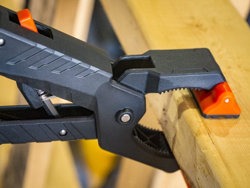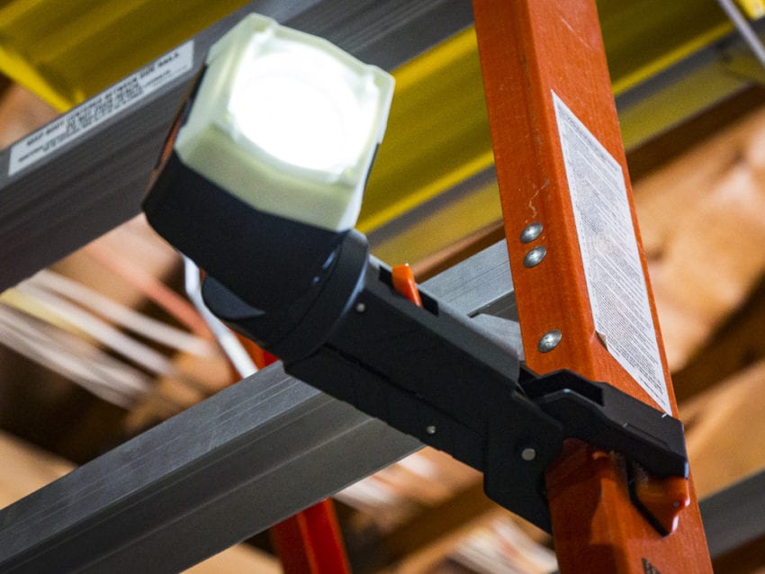 The Klein Clamping Worklight uses a 2โณ clamp to attach to, well, just about any surface you can wrap the clamps around. Ladders, buckets, studs, and joists are all ideal candidates for this light. It also has plastic teeth just above the rubber clamping feet that give it the ability to clamp on conduit or other pipes. A quick-release tab loosens the clampโs grip from the surface.