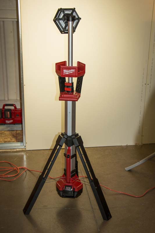 The compact Milwaukee M18 LED Stand Light with TrueView color weighs 15 pounds with the battery. Itโs a tripod style LED work light and is super stable. This bright LED workย light can extend up toย 7ย feet in height and rotateย to throwย 2000 lumens in any direction.