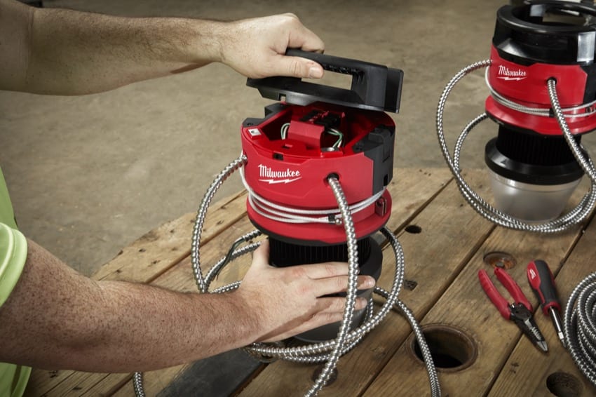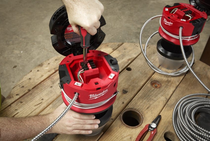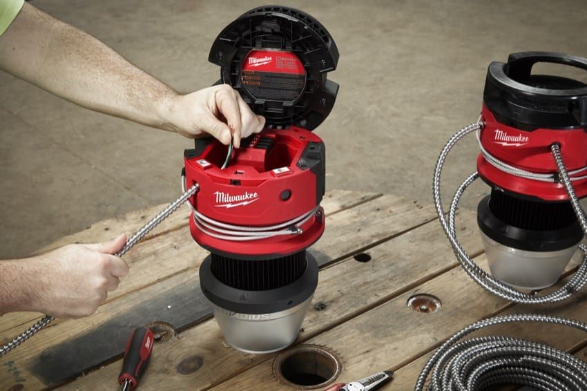 The new Milwaukee Radius 130w LED Temporary Site Light comes with a 3 ft, 120V power cord, but it also features an integrated wiring terminal. Multiple lights can be wired in series using MC or ROMEX cable, and they accept voltages from 120V to 277V. These lights also feature quick-feed cable retention, which allows you to speed up the installation process.