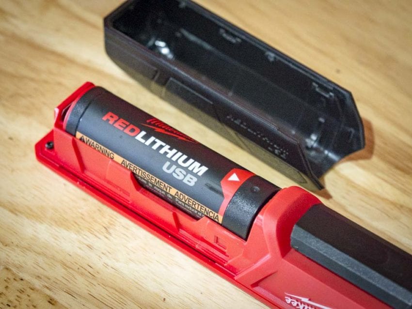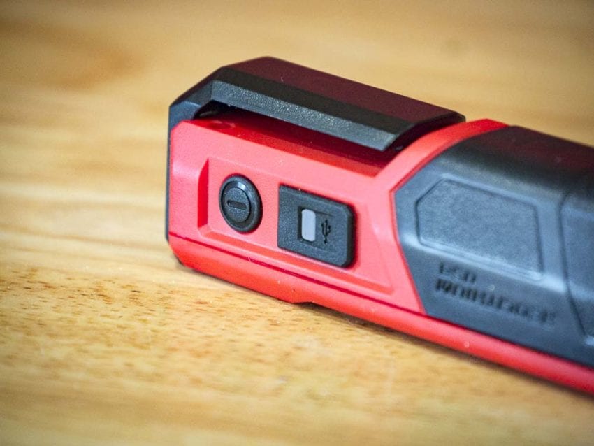 The Milwaukee Rover Pocket Flood Light battery can be recharged on board via the micro USB port just below the power button. If you need to swap batteries, the access door is below the clip. Itโs on the tough side to open since it fits pretty tight. It also doesnโt slide all the way off like youโd expect. It pulls back about half an inch, then needs to be lifted up. Itโs more noticeable when you replace the door since you have to seat it in a forward position before sliding it closed.