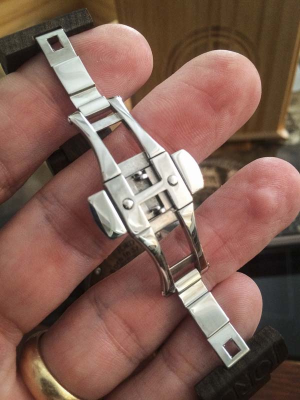 Putting on and removing the watch is done by simply pressing the deployment buckle with the central push button. This allows each side of the band to release, giving you room to slip the watch on or take it off. Itโs easy to use, and I never felt or experienced the watch coming off prematurely.