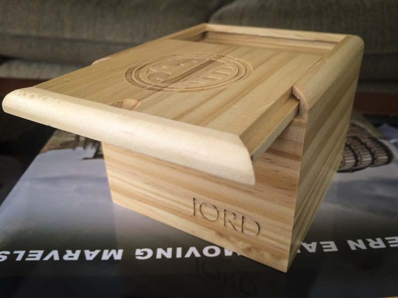 Each one ships in a custom wooden box featuring the Jord logo. The lid of the box slides open to reveal the watch which is carefully packed inside. The Jord Fieldcrest Series is a classic midsize watch, so it works well with those of us who donโt have gigantic wrists and hands. It has a rich-lookingย black wood face that shows the wood grain underneath.
