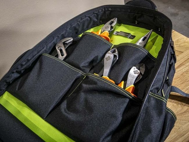 I really like the way the Greenlee 0158-26 backpack lays out its pockets in a way that encourages you to separate your tools from your meters. There enough storage for your go-to tools and meters, plus room for a cordless drill, tape, tape measures, and a water bottle.