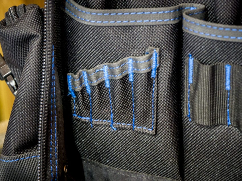 Before we get into the features of this product, letโ€™s look at the way itโ€™s built. A backpack can have the most thoughtful design in the world in terms of storage and organization, but if it falls apart after the sixth use, why bother with it? After all, these types of tool storage solutions tend to carry a fair amount of weight. Between being lugged and hoisted around, as well as being exposed to plenty of abrasive and sharp materials on any given job site, tool backpacks need to implement durable materials and stitching in their design.