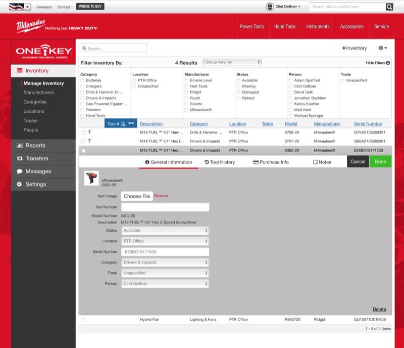 With Milwaukee One-Key you can not only add Red tools to your inventory but also tools from other manufacturers. That makes this a decent system for tracking what you have as well as which tools are in the tool crib, on a job site, in need of repair, or even missing. You can tag each tool with model and serial numbers, category, location, trade, and person. This lets you use the system for insurance claims as well as getting a location on your tools.