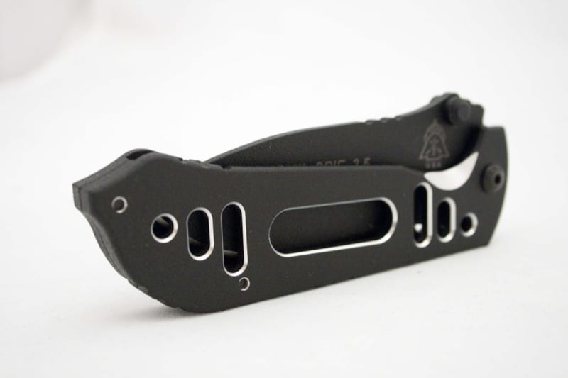 The center oval is actually a bottle opener. Top may not have designed theย Tops Mil-SPIE 3.5 folderย that way. If not, then you heard it here first. Oddly enough, the aluminum used in the handle of this knife is the same kind used in the secondary chambers of many pistol suppressors.