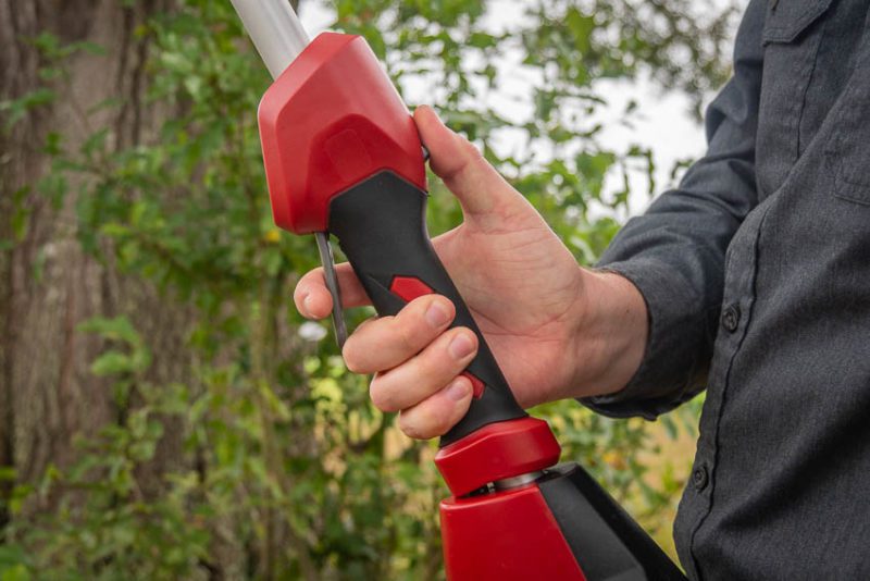 This pole saw has a self-lubricating system similar to a regular chainsaw so thereโs no need to stop working to apply oil. The reservoir holds a few ounces of your favorite bar oil and a translucent tank gauge makes it easy to see when itโs time to refill.