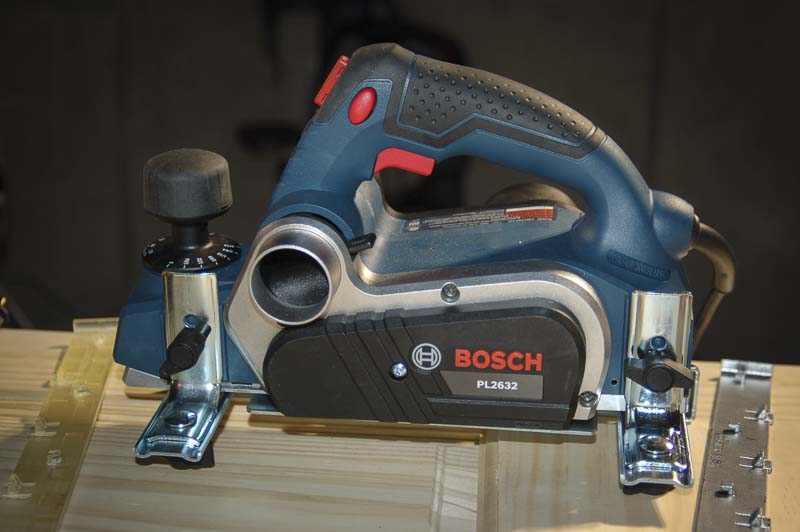 The Bosch PL1632 3-1/4 in. planer has both an ambidextrous “lock-off” release button to turn the tool off quickly regardless of which hand it’s in, and a lock-on button for when you need to use it for extended periods. Also, while most fences have a single mounting point, Bosch used a dual-mount guide fence (with mount points at the front and back of the tool) with a protective shield that you can use for planing door edges. A plastic overshoe is also included to help prevent marring door facets. The PL1632 3-1/4″ planer includes a single blade drum and has a 1.6 mm depth of cut. Retail for this tool is $119 including the fence. The upcoming Bosch PL2632 3-1/4″ planer is going to be the step up model with a full 2.6mm depth of cut, more advanced dust control system, and a two-blade drum for better wood removal.