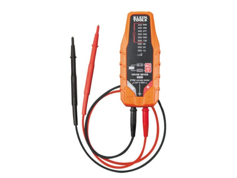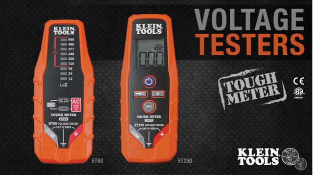 There are a lot of things to like about Klein Tools, not the least of which is the companyโs ability to hear and respond to its customerโs needs and provide great products to meet those needs. Brand new from Klein are two new voltage testers โ the Klein ET60 and the Klein ET250. Both measure up to 600V, have Cat IV ratings, and both have Kleinโs Tough Meter attributes that seem to be quite popular with Pros. The Tough Meter design means the tool can take a lickinโ and keep on tickinโ, in a manner of speaking. Please donโt actually lick your meters!