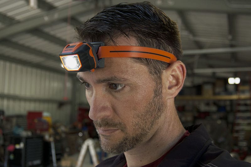 The headlamp has the capability to tilt 45 degrees and has two modes options. A center spotlight mode produces 150 lumens with up to 6 hours of run time. Two side oriented LEDโs operate as a floodlight mode and generate 50 lumens with up to 10 hours of run time. Simply click the power switch to change between spot, flood, and off.