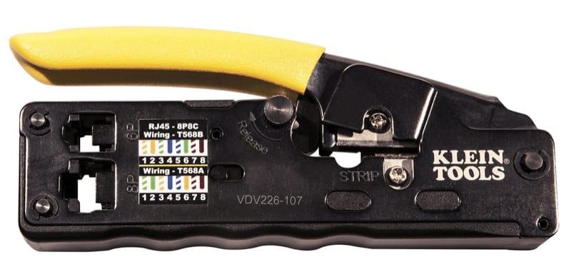 This is a nice one-handed tool that looks easy and comfortable to use. It even includes the most commonly-used wiring diagrams right on the tool itself, including T568B and T568A 8-conductor layouts. That means people like me who donโt spend all day long crimping (and subsequently forget the pattern) can reference them as needed. You can also download more wiring diagrams (via Kleinโs website) to your smart phone.