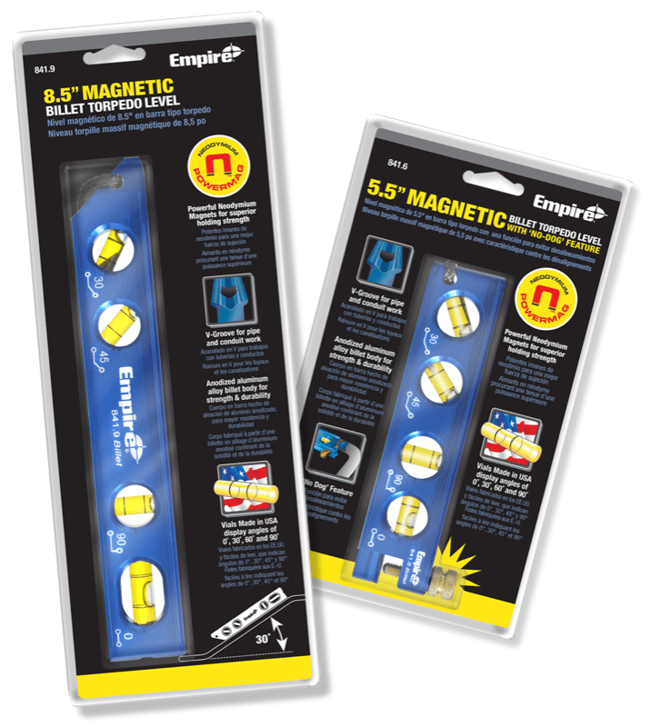 Even if youโve a roofing pro, at one point or another youโll have to consult the manual. Problem is, nobody ever keeps it around. No worries, Empire Level laser etched a handy QR code on their new rafter square so all you need to do is take a snapshot of it with your smart phone and youโve got the PDF right there. We tried it and it works great. Empire also released a couple of new levels, including an Empire 8.5โณ Billet Aluminum Magnetic Torpedo Level and a 5.5โณ Billet Torpedo Level with a new โNo-Dogโ feature. Both levels looks great, but the โNo-Dogโ feature of the 5.5โณ Torpedo is innovative in that the level pinches and clamps onto the outer ring of a piece of conduit from within, ensuring that you donโt dogleg, or bend your pipe off-plane.