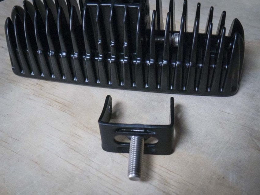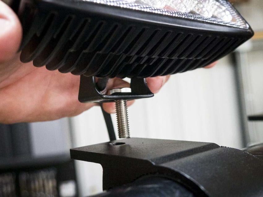 Next, itโ€™s time to assemble the lights and brackets. These brackets hold the LED lights to the mounts we just installed on the ROPS. Each LED needs to have the U-shaped brackets attached. To do this, make sure you place the stainless bolt (hex bolt) through the U bracket before attaching the bracket to the LED. I didnโ€™t the first time, so I had to backup and start over.